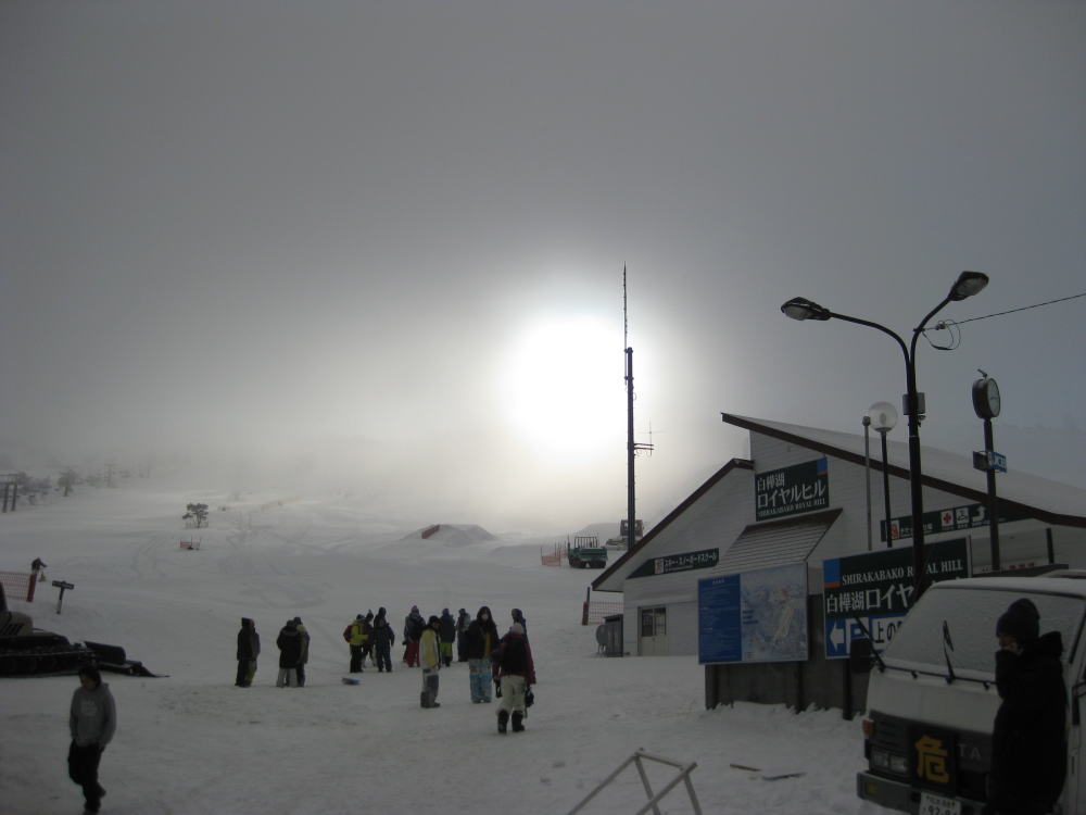 滑れるようなコンディションではないが、とりあえず滑りの支度を行い、霧が晴れるのをただただ待つことに・・・