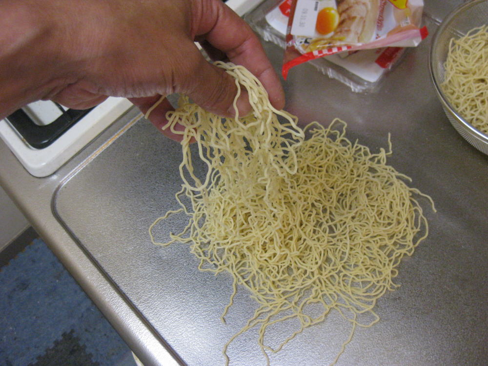それから、この麺を茹でる受け皿は鍋ではなく、中華鍋(フライパン)を使う!!