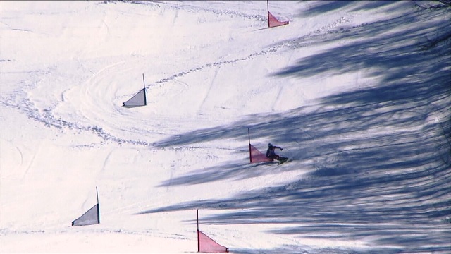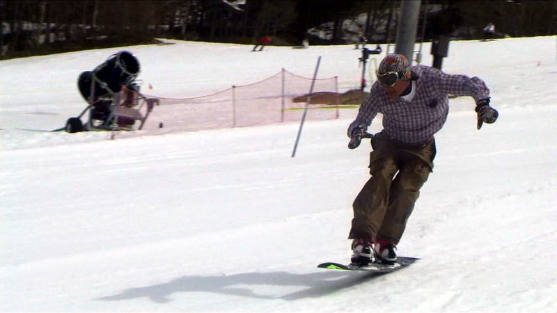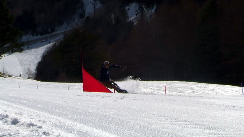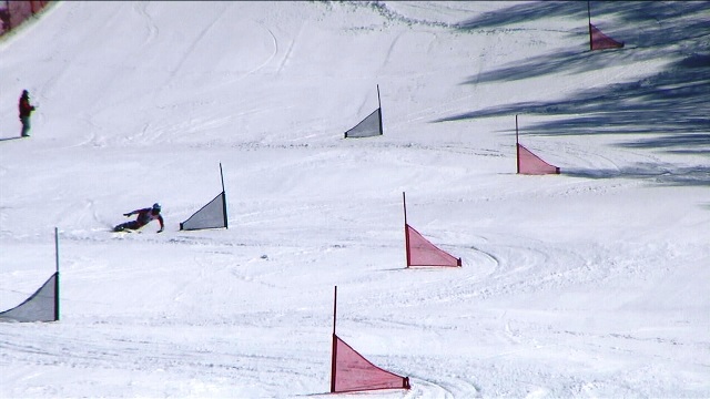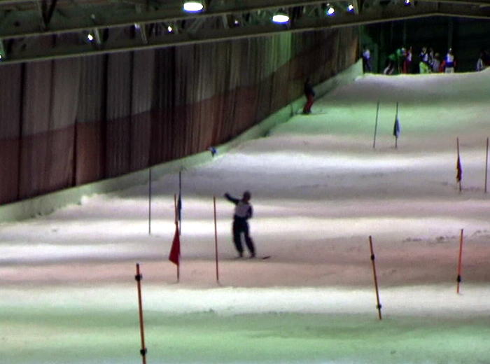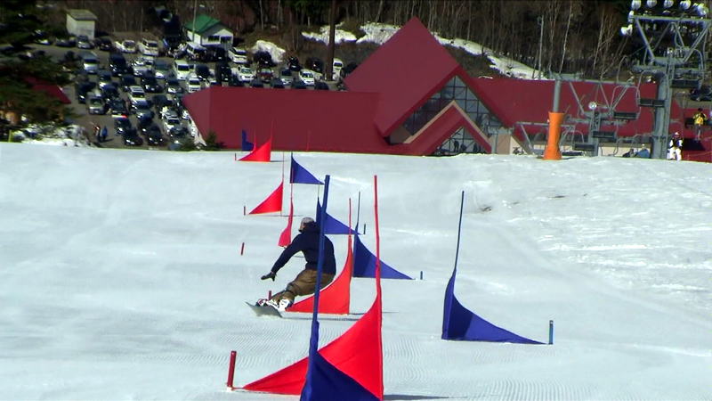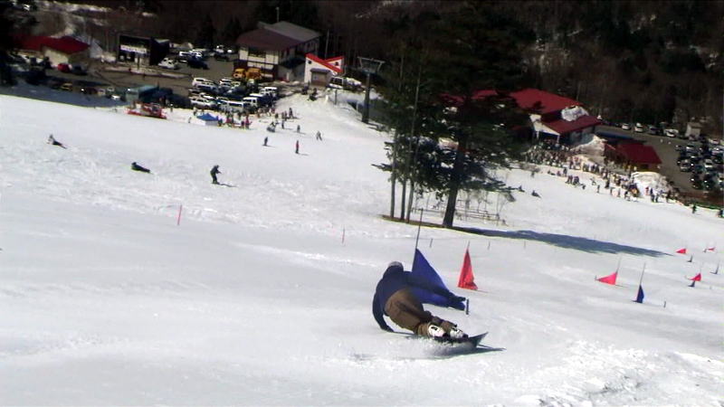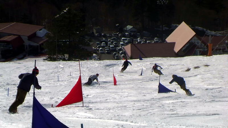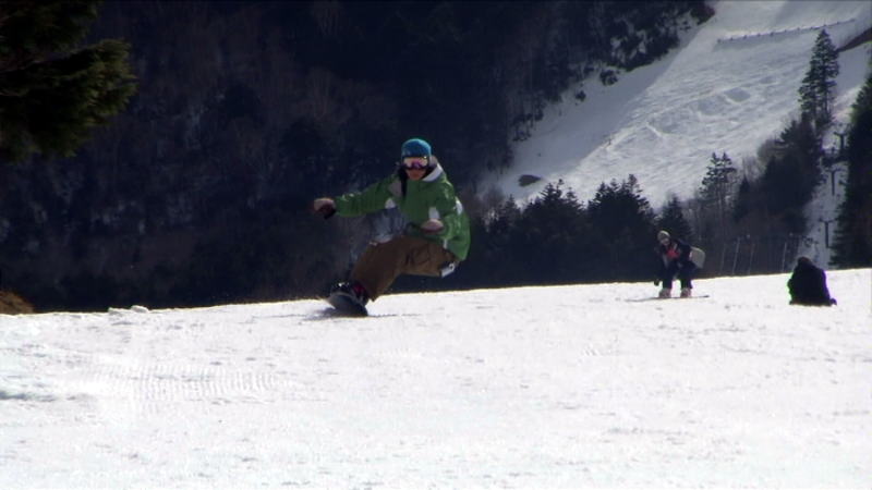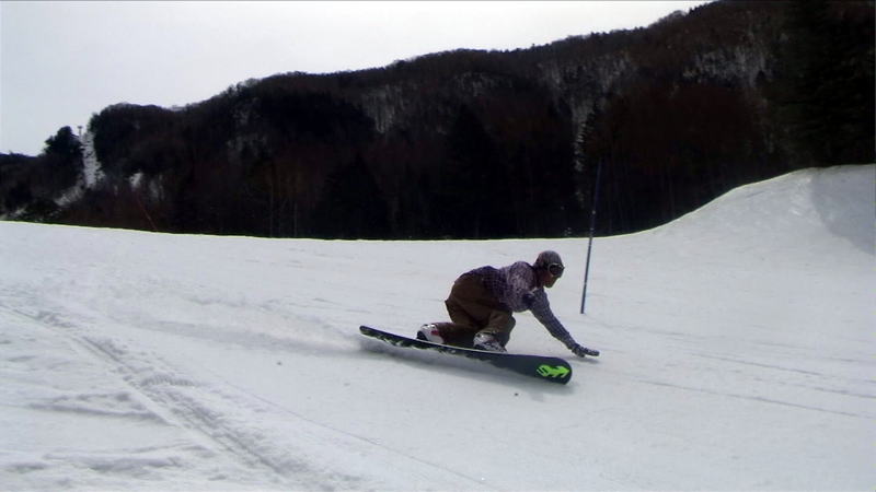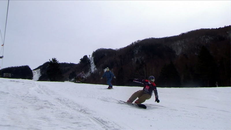 最初にスノボーが滑り、その後にスキーが滑走