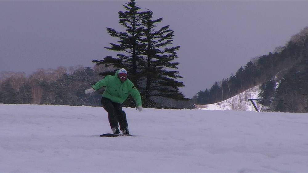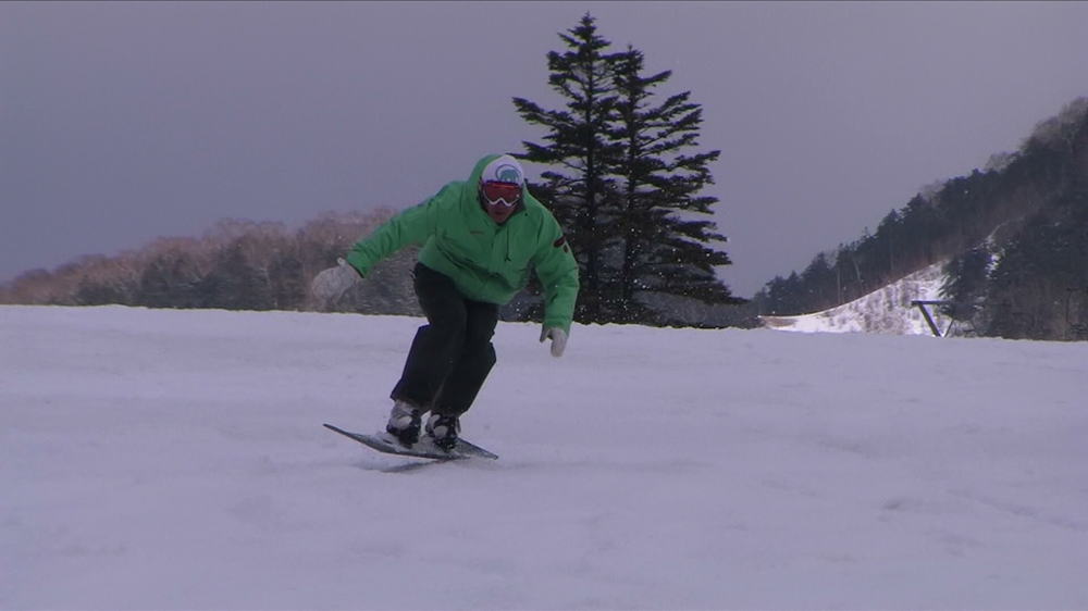 まだまだ改良の余地ありの滑りであるが、後ろ足加重を意識した滑り方と、絶対的に状態が開かないとうか、上体とボードの動きが同じというポジショニング!!