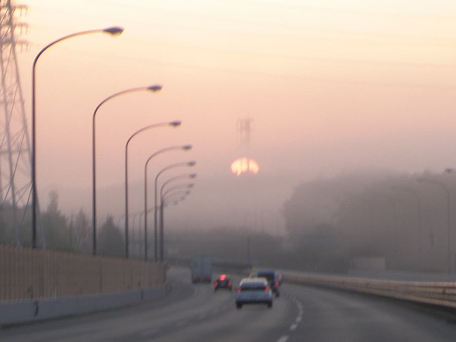 朝もやの湾岸道路から見た朝日はGood!!